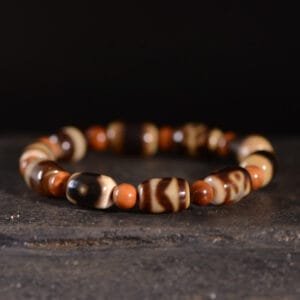 Dzi bead (Tib. གཟི།; pronounced “zee”; alternative spelling: gzi) is a type of stone bead of uncertain origin worn as part of a necklace and sometimes as a bracelet. Dzi beads are precious jewelry from Tibetan culture which is generally prized as protective amulets,these beads are believed to attract local protectors, dharmapalas or deities or maybe beneficial ghosts, ancestors or even bodhisattvas. Because of this, dzi beads are always treated with respect in Tibetan culture. Nine-Eye Dzi Bead is the symbol of The Nine Planets, It includes the activity of the Universe and the wisdom of the humanity. Nine-eyed beads is the most popular of all Dzis, brings all kinds of luck and blessings; protection, good health, purify negative energy expand intelligence and wisdom. Wearing our Tibetan Agate Dzi Beads bracelet, which can help the investors with the successful development of new ideas in rolling in wealth.