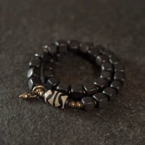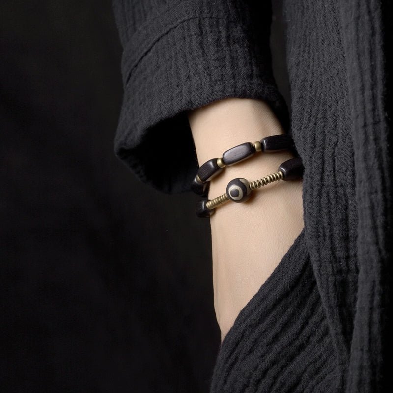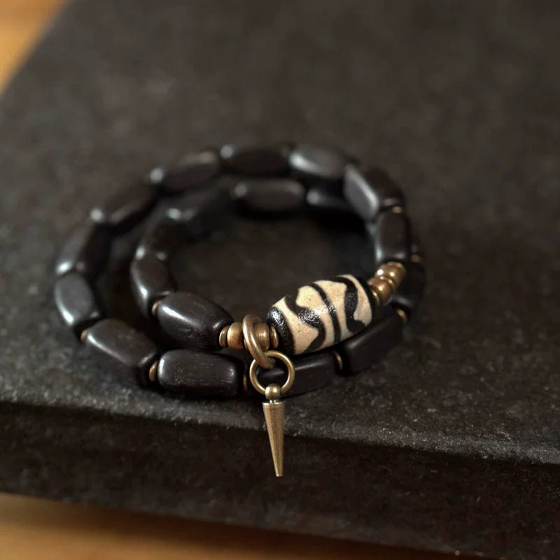 This double-wrap bracelet blends tradition and strength with a refined, masculine touch. Handcrafted with natural ebony wood beads, accented by a Tibetan Dzi bead and vintage brass spacers, it carries deep symbolic meaning rooted in ancient culture.
