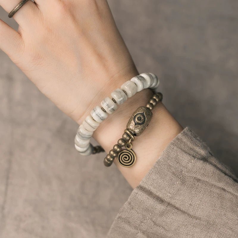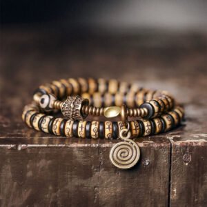 This handcrafted double-wrap Tibetan-style bracelet features hand-carved bone beads as the centerpiece, each one etched with symbolic motifs rooted in Himalayan tradition. Designed to wrap twice around the wrist, it adds a layered, bold presence. Polished ebony wood spacers provide visual contrast and grounding energy, while vintage brass accents and a small agate Dzi bead complete the piece with spiritual resonance and earthy warmth.