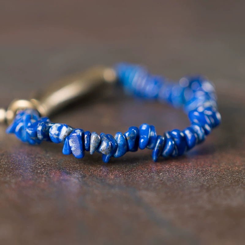 This vintage-inspired bracelet pairs deep blue, irregular-shaped lapis lazuli beads with warm, hand-polished brass accents in a minimalist single-strand design. It’s a perfect everyday piece for both men and women seeking balance, clarity, and timeless style.