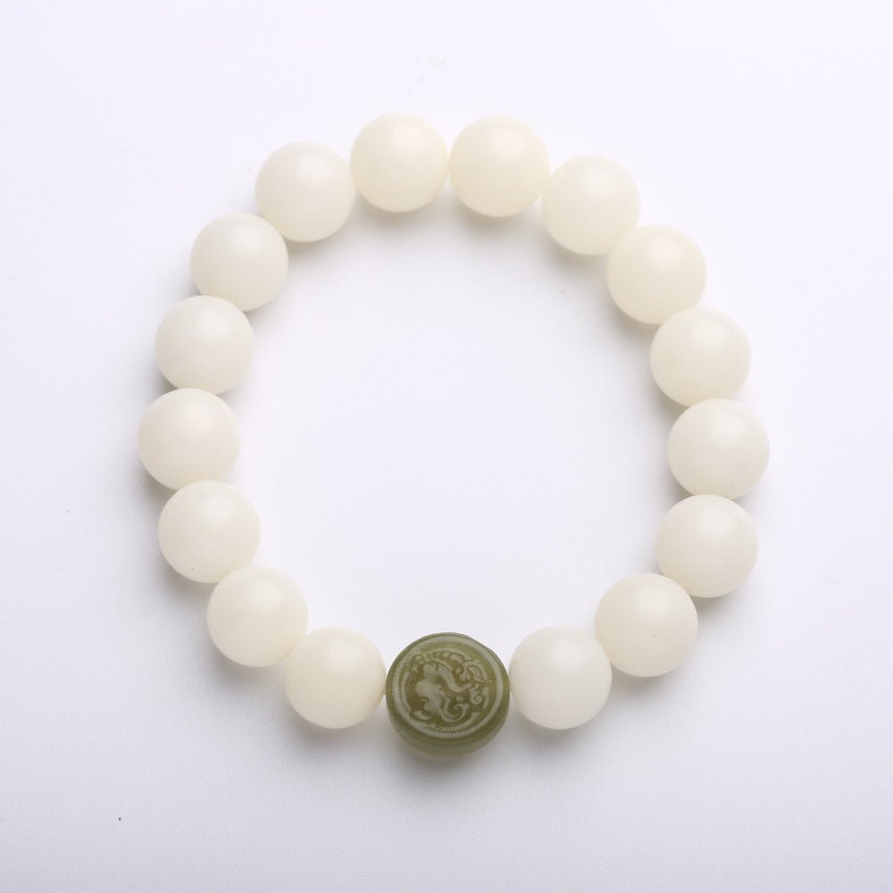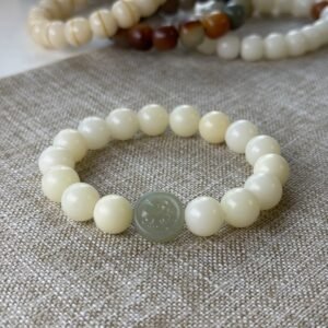 The Kirin Jade Bodhi Protection Bracelet is a thoughtful blend of elegance and symbolism. Featuring smooth white Bodhi seed beads and a single intricately carved Hetian jade Kirin centerpiece, this bracelet pays homage to the ancient East Asian guardian of peace, prosperity, and integrity.