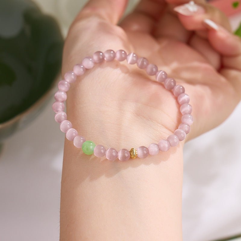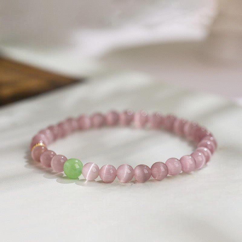 Infused with grace and soft elegance, the Pink Cat’s Eye with Green Chalcedony Bracelet blends soothing pastel beauty with gentle energy. The combination of shimmering pink cat’s eye beads and a single vivid green chalcedony accent creates a harmonious balance of femininity and vitality.