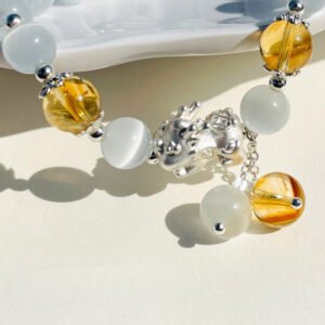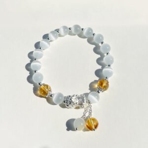 Infused with protective energy and spiritual significance, the Pixiu Cat’s Eye Crystal Bracelet harmonizes the powerful symbolism of the Pixiu with the radiant glow of cat’s eye crystals. The Pixiu, a mythical creature known for its ability to attract wealth and ward off negative energies, is paired with shimmering cat’s eye beads that reflect light in a mesmerizing way. This bracelet channels positive energy, enhances intuition, and invites prosperity while maintaining a sense of calm.
