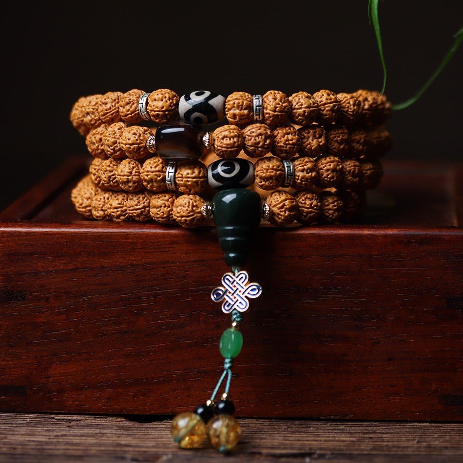 Discover the timeless energy of the Himalayas with our Dragon Vein Rudraksha 108 Mala Beads Bracelet. Each bead features rare “exploding dragon vein” textures, layered and distinct like two dragons coiled in harmony. Made from century-old Rudraksha seeds sourced from the same tree, these beads are crafted with a low-profile, flat-head design for comfort, making it an exceptional piece for meditation, daily wear, or spiritual practice.