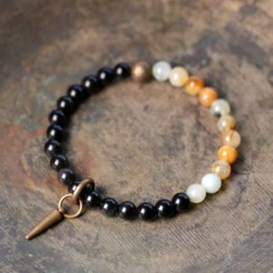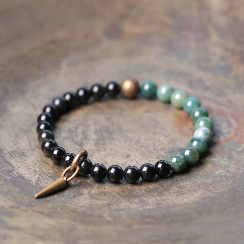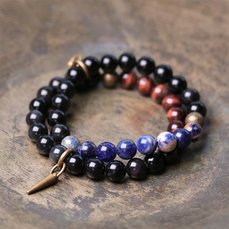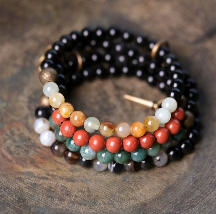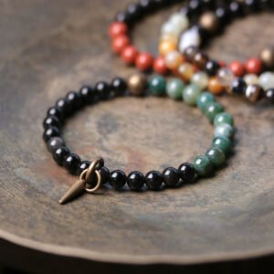 This handcrafted Tibetan-style obsidian bracelet features smooth black obsidian beads accented with colorful gemstone details and vintage-inspired brass spacers, blending protection energy with joyful expression.