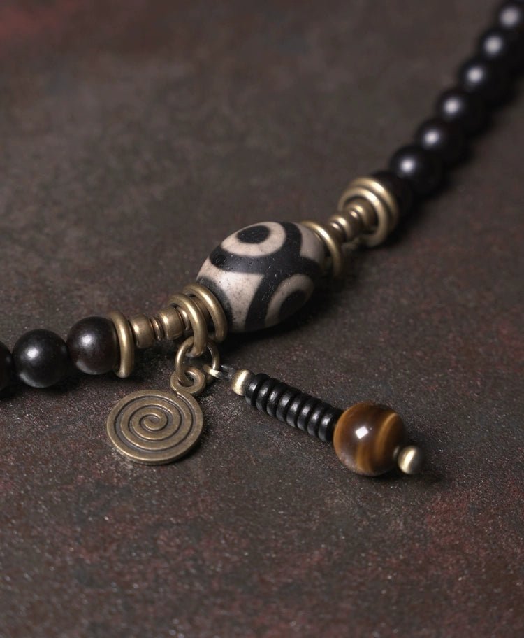 📿 Materials: Ebony wood beads (~8mm), Tiger eye stones, Brass spacers, Alloy accents, Three-eyed Dzi bead (~22 × 14.5mm)