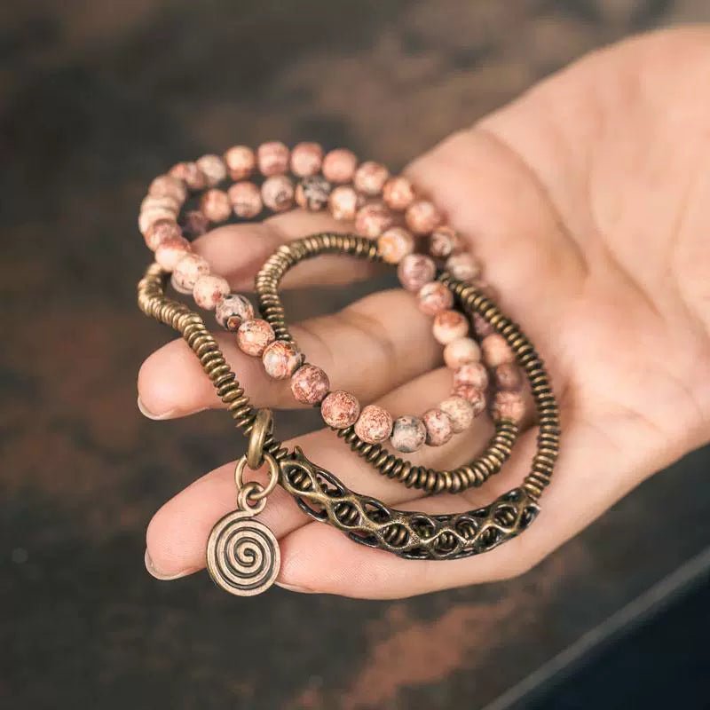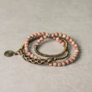 This handcrafted long wrap bracelet features flower red jasper beads paired with vintage-style brass spacers, blending bold earth tones with grounding spiritual energy. The extended multi-layer design allows it to be worn as a multi-wrap bracelet or as a statement necklace, perfect for those seeking mindful adornment with a rustic, timeless feel.