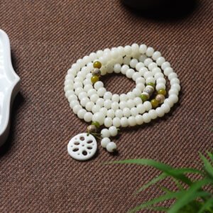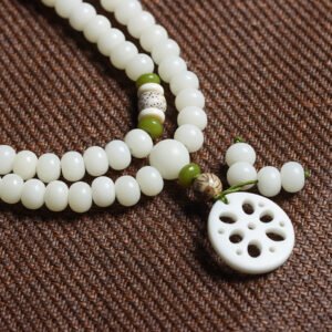 The full 108-bead mala supports mantra recitation, breath awareness, or quiet reflection. The naturally cool touch of white jade brings peace and clarity, while the lotus slice—carved from natural material—serves as a gentle reminder of inner resilience and spiritual growth.