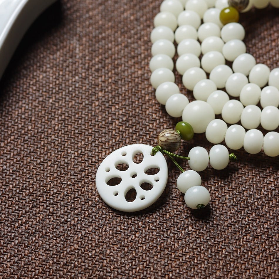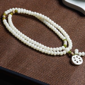 ✅ Materials: White jade bodhi beads + hand-carved lotus slice pendant